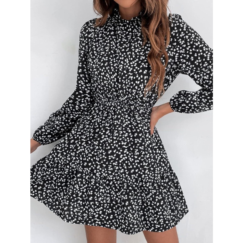 - Feature: Floral print, long sleeve, frill trim, stand collar, a line short dress