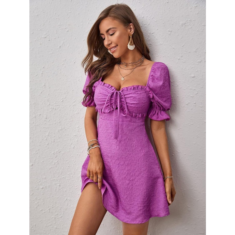 - Feature: Sweetheart Neck, Short Sleeve, Frill Trim, Knot Front, High Waist, Casual Flared Mini Dress