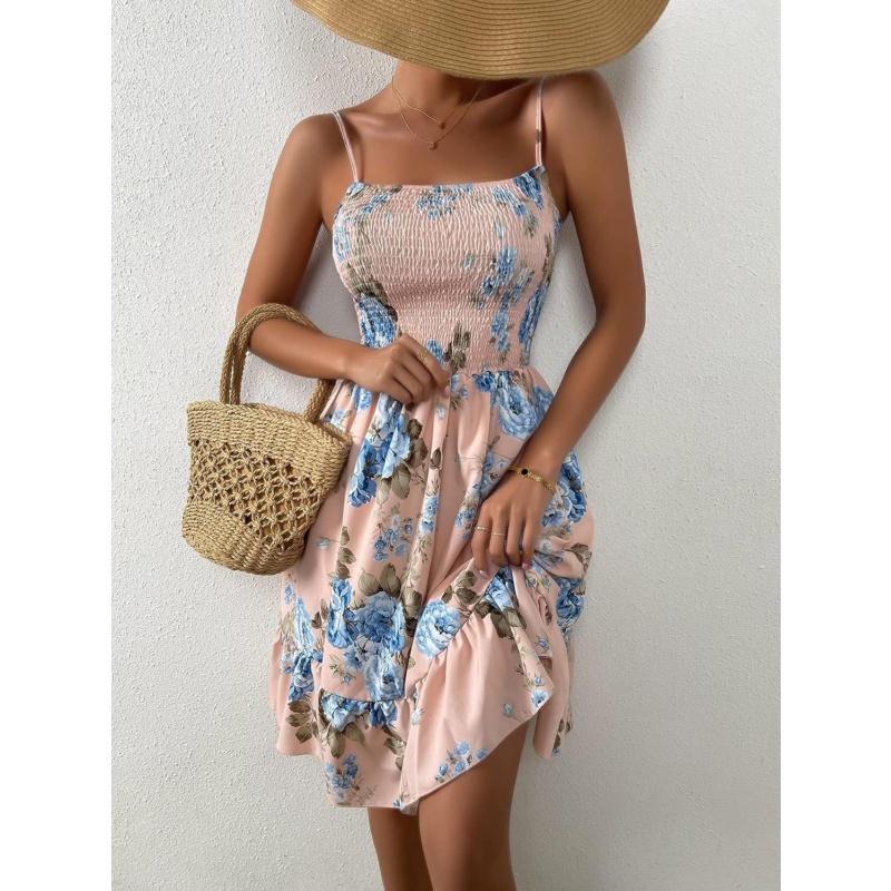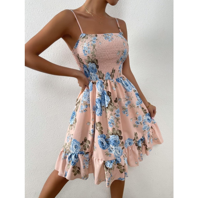 WDIRARA Womens Floral Sleeveless Mini Dress Shirred Ruffle Hem A Line Dresses