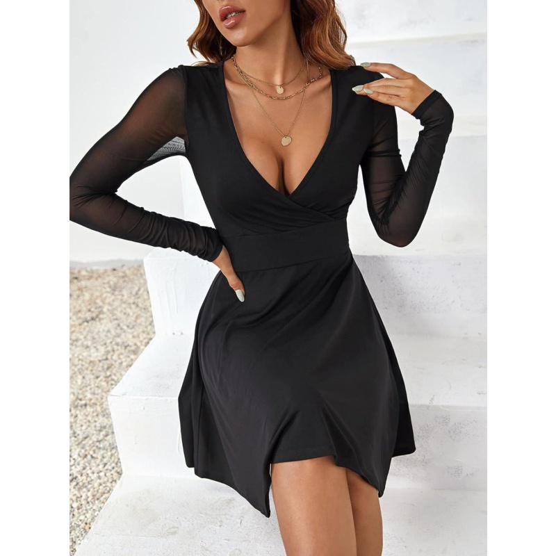 - Features: contrast mesh, sheer, long sleeve, v neck, flared, solid color, fitted dress