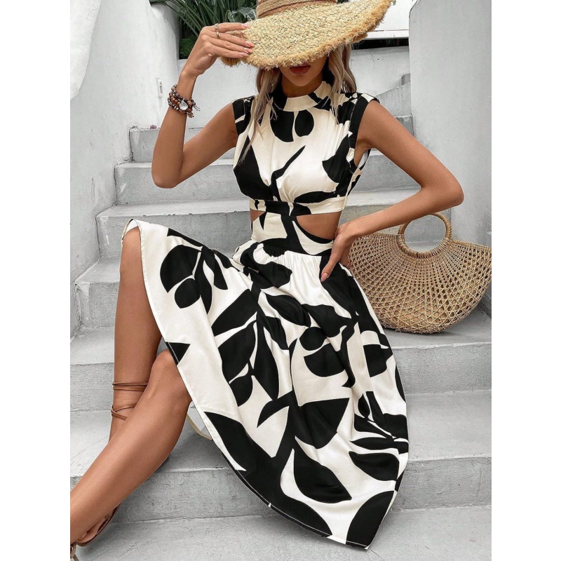 - Features: plants print, cut out, mock neck, cap sleeve, ruffle hem dress