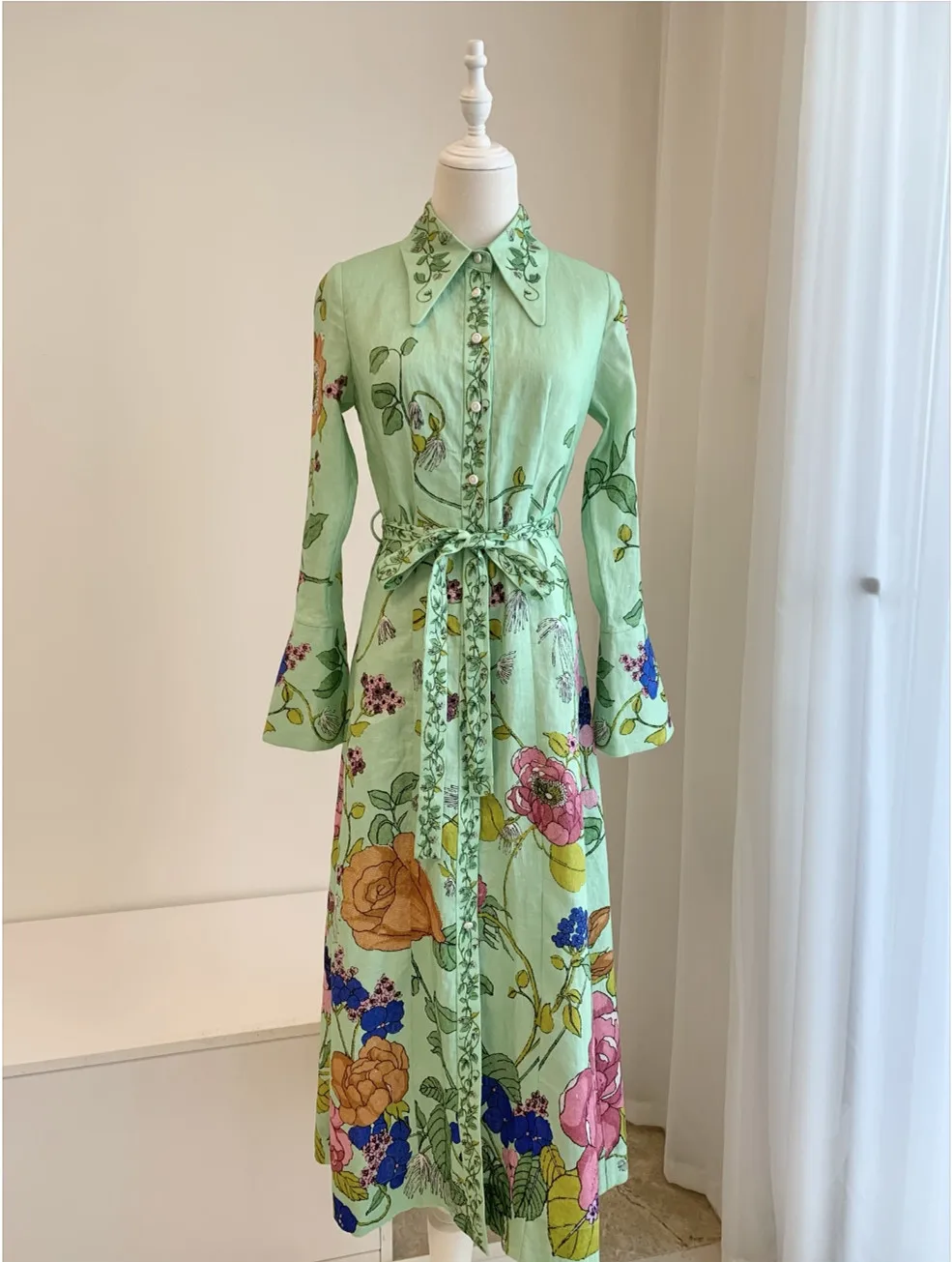 Women Flower Printed Single Breasted Long Sleeve Shirt Style Maxi Long Dress