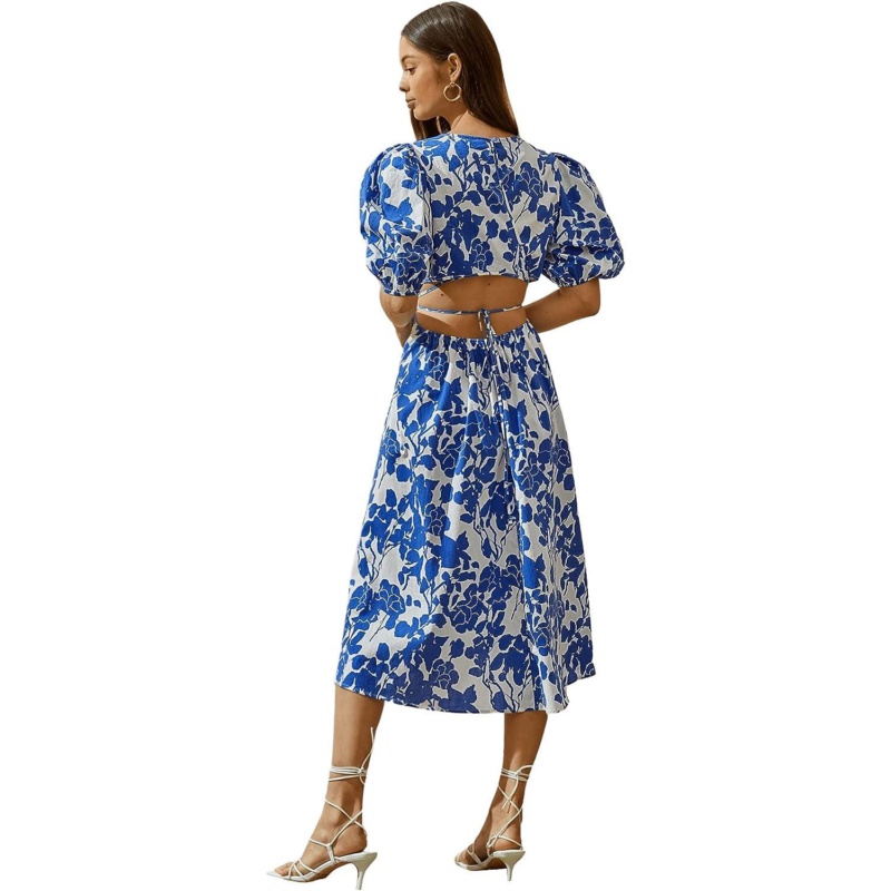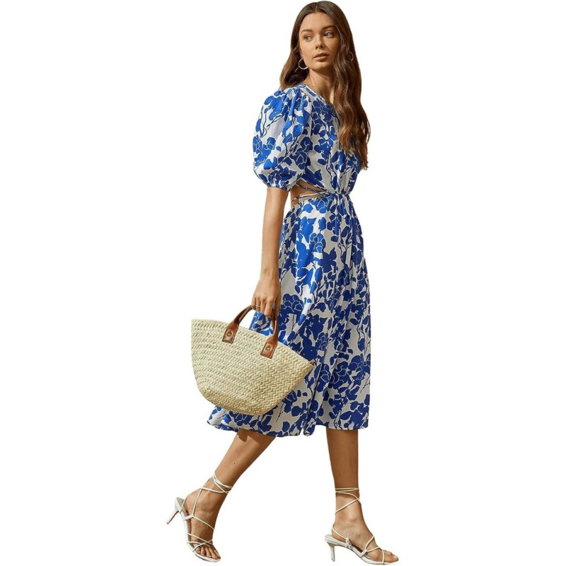 SweatyRocks Womens Boho Floral Puff Sleeve Cut Out Dress Tie Back A Line Midi Dresses