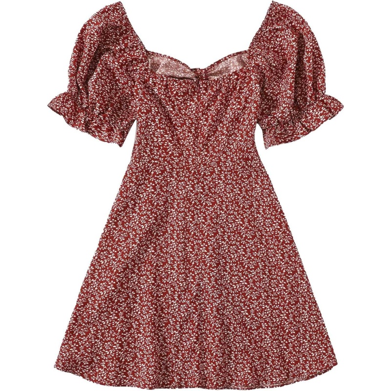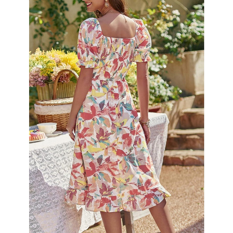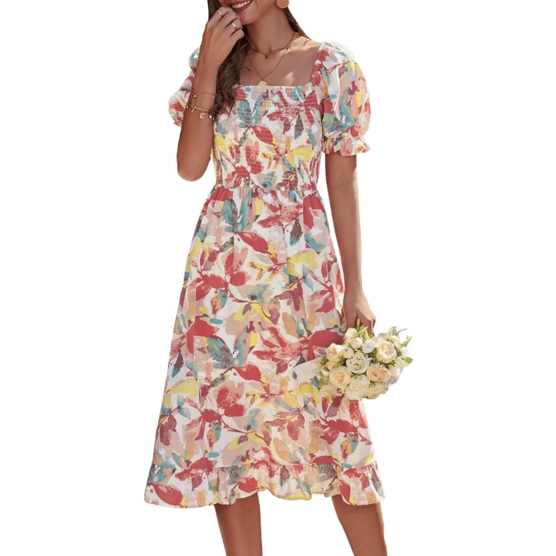 SweatyRocks Womens Square Neck Allover Plants Print Puff Sleeve Shirred Flowy A Line Dresses