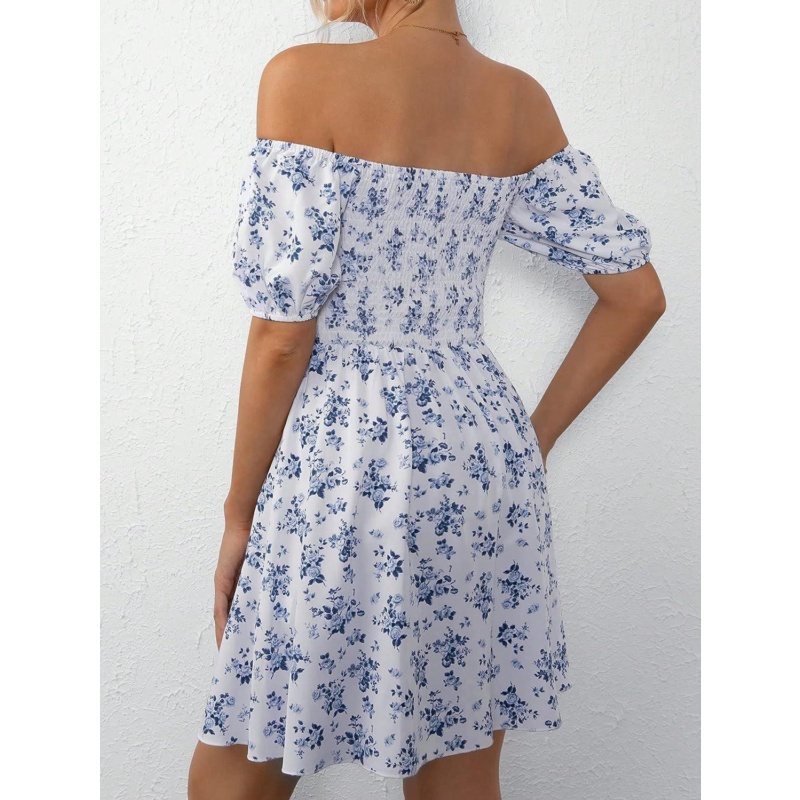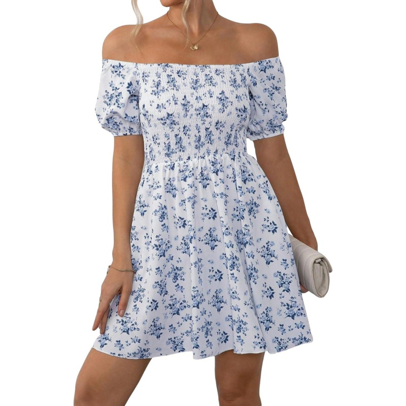 SHENHE Womens Floral Print Shirred Off Shoulder A Line Short Sleeve Flowy Boho Dress
