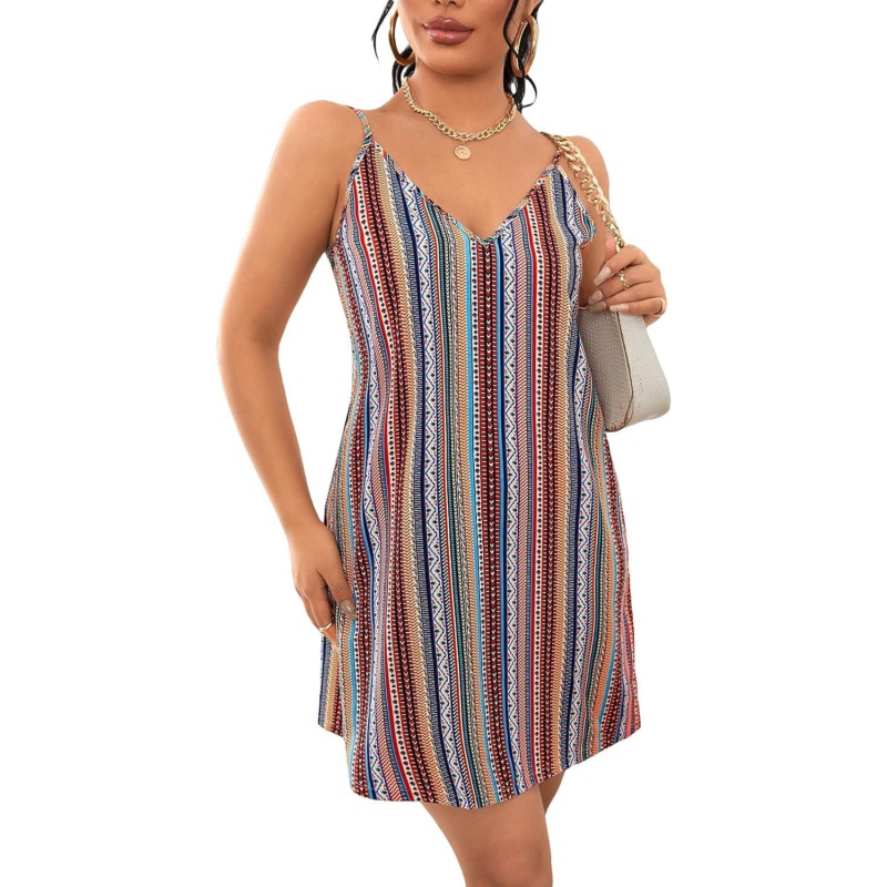 SHENHE Womens Striped Geo Print V Neck Spaghetti Strap Sleeveless Mini Dresses