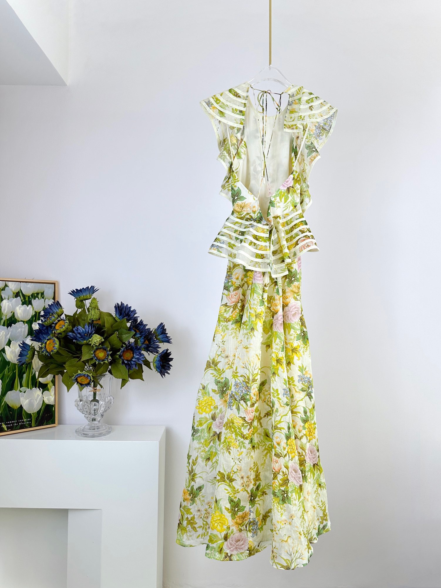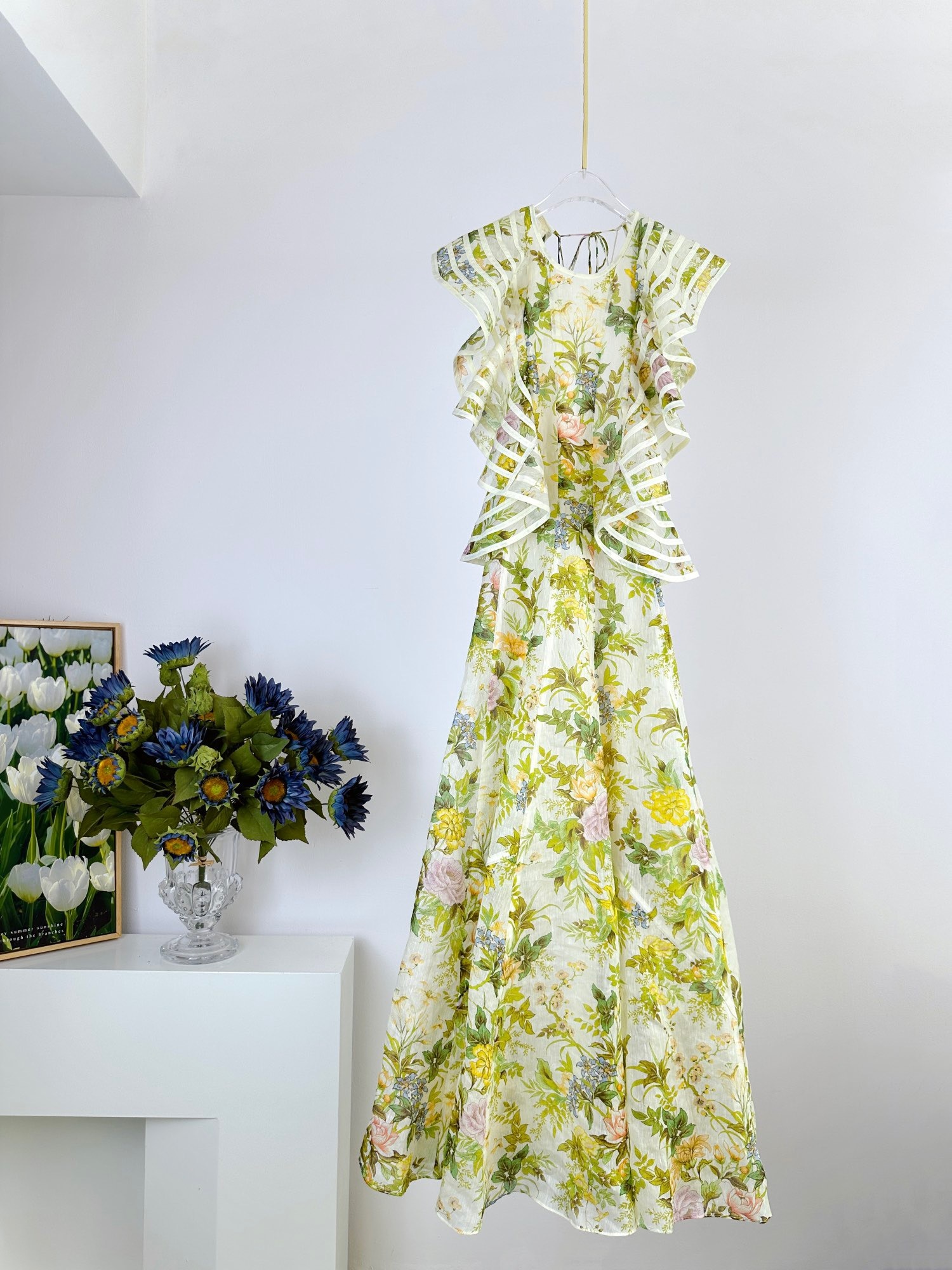 Lvydala High Street Fashion Women Ruffle Sleeve Charming Flower Print Midi Long Silk Linen Dress