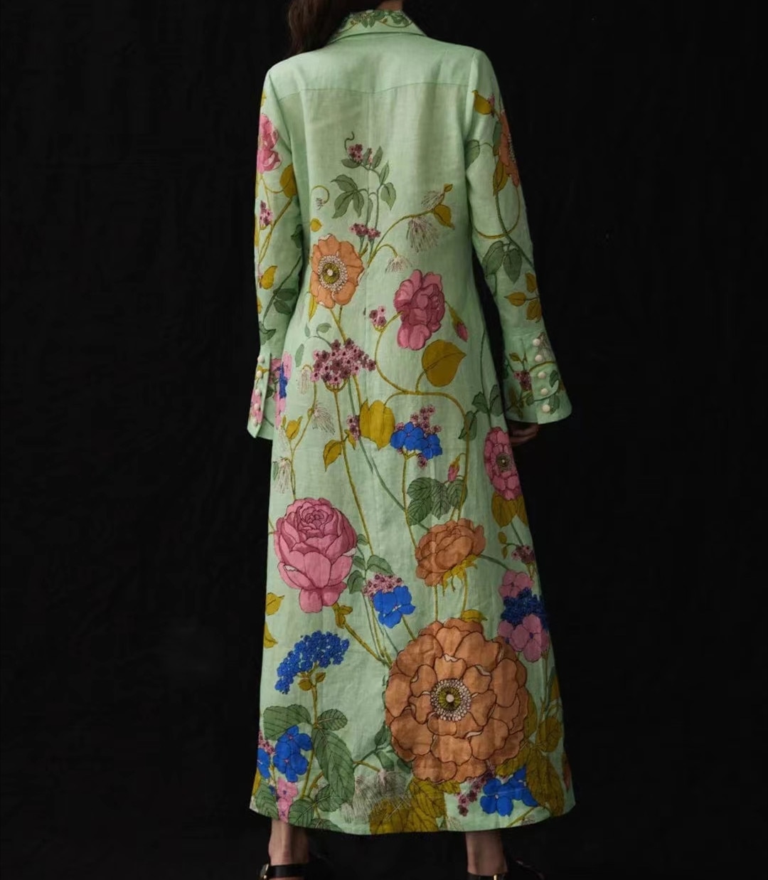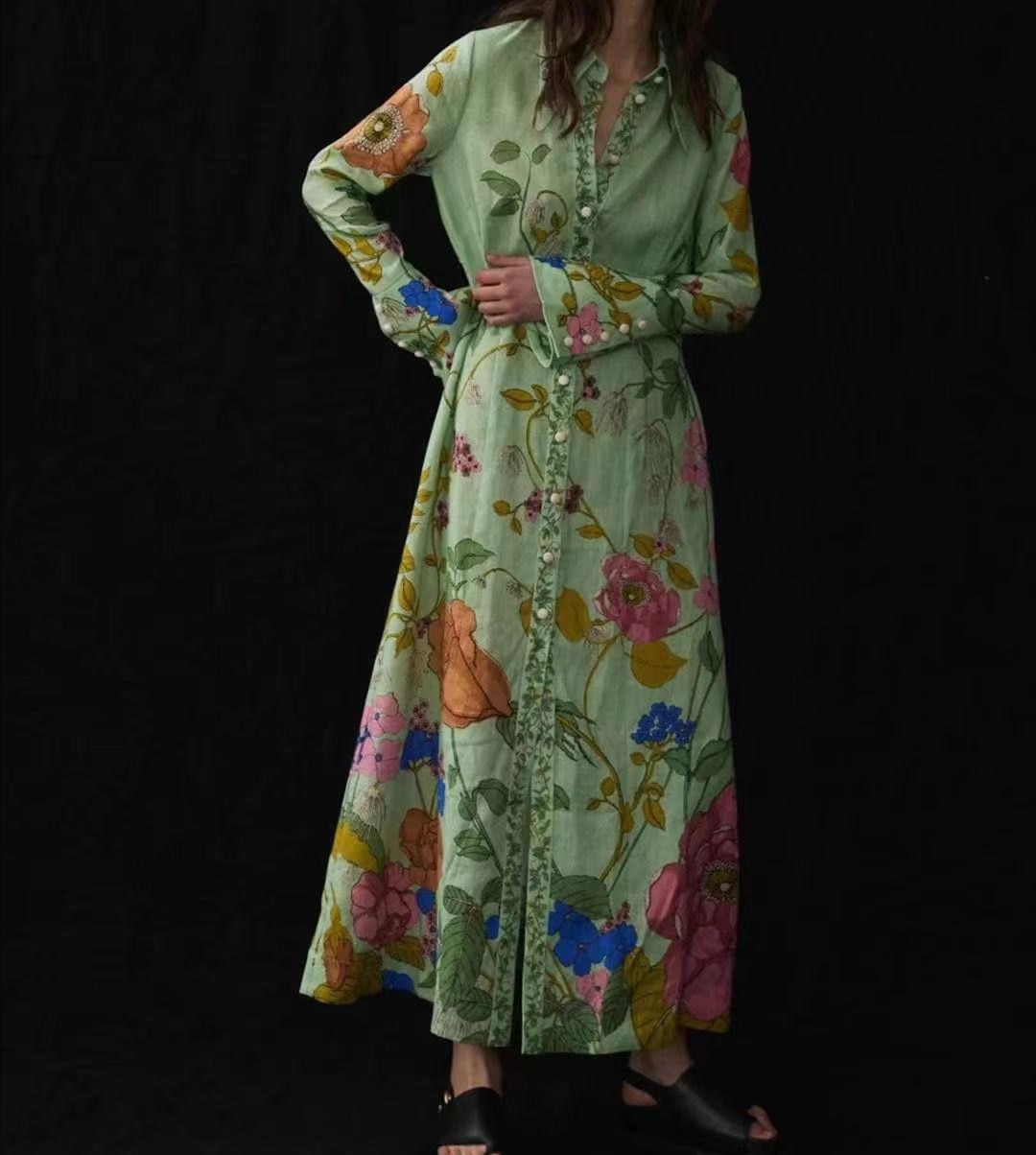 Women Flower Printed Single Breasted Long Sleeve Shirt Style Maxi Long Dress